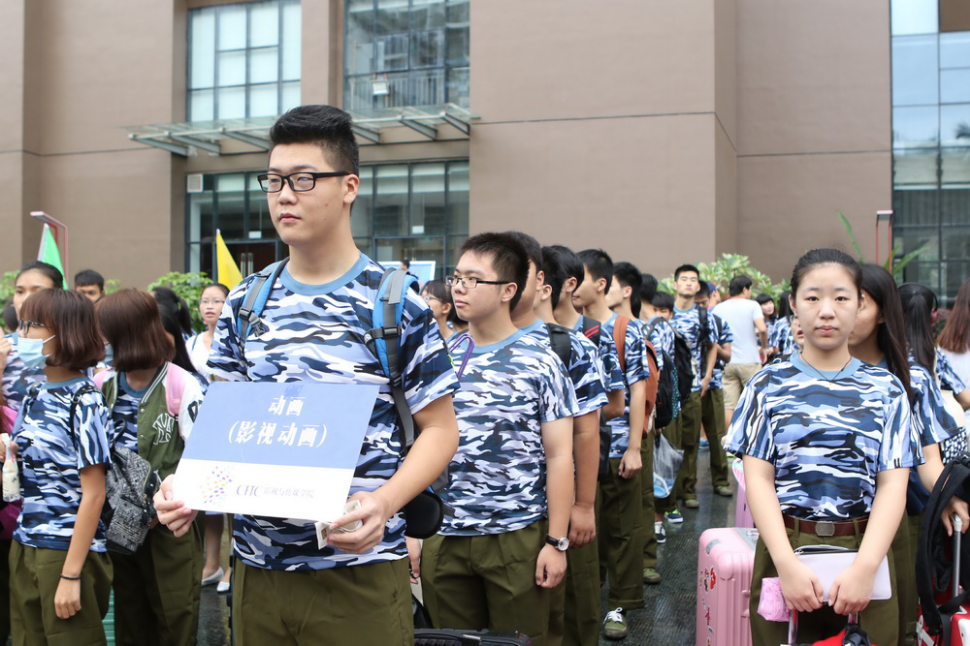 同学们正有序的排队候车前往训练基地