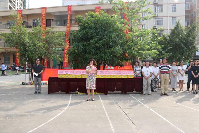 学校领导为新生分发解暑饮品