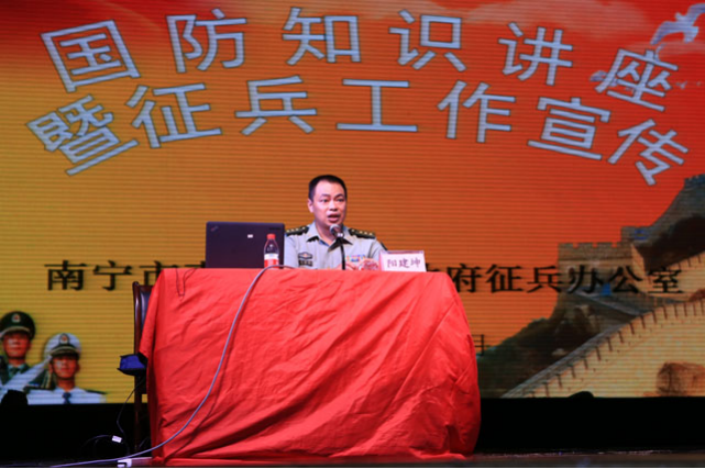 紧接着,青秀区武装部部长阳建坤分别从为什么要当兵、当兵的好处、高等学校大学生应征入伍享受的优惠政策、征兵的条件和程序等四个方面对征兵工作各项具体事宜进行了详细讲解,并对现场学生的问题一一作答。活动结束后,不少学生对应征入伍表现出了浓厚的兴趣,纷纷上前咨询;青秀区武装部工作人员在现场发放了征兵宣传单,以便能够让学生更为详细地了解征兵政策和入伍具体事项。